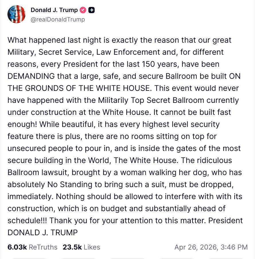Президент США Дональд Трамп заявил, что стрельба во время ужина для корреспондентов Белого дома не произошла бы, если бы на территории Белого дома был "большой и защищенный бальный зал".