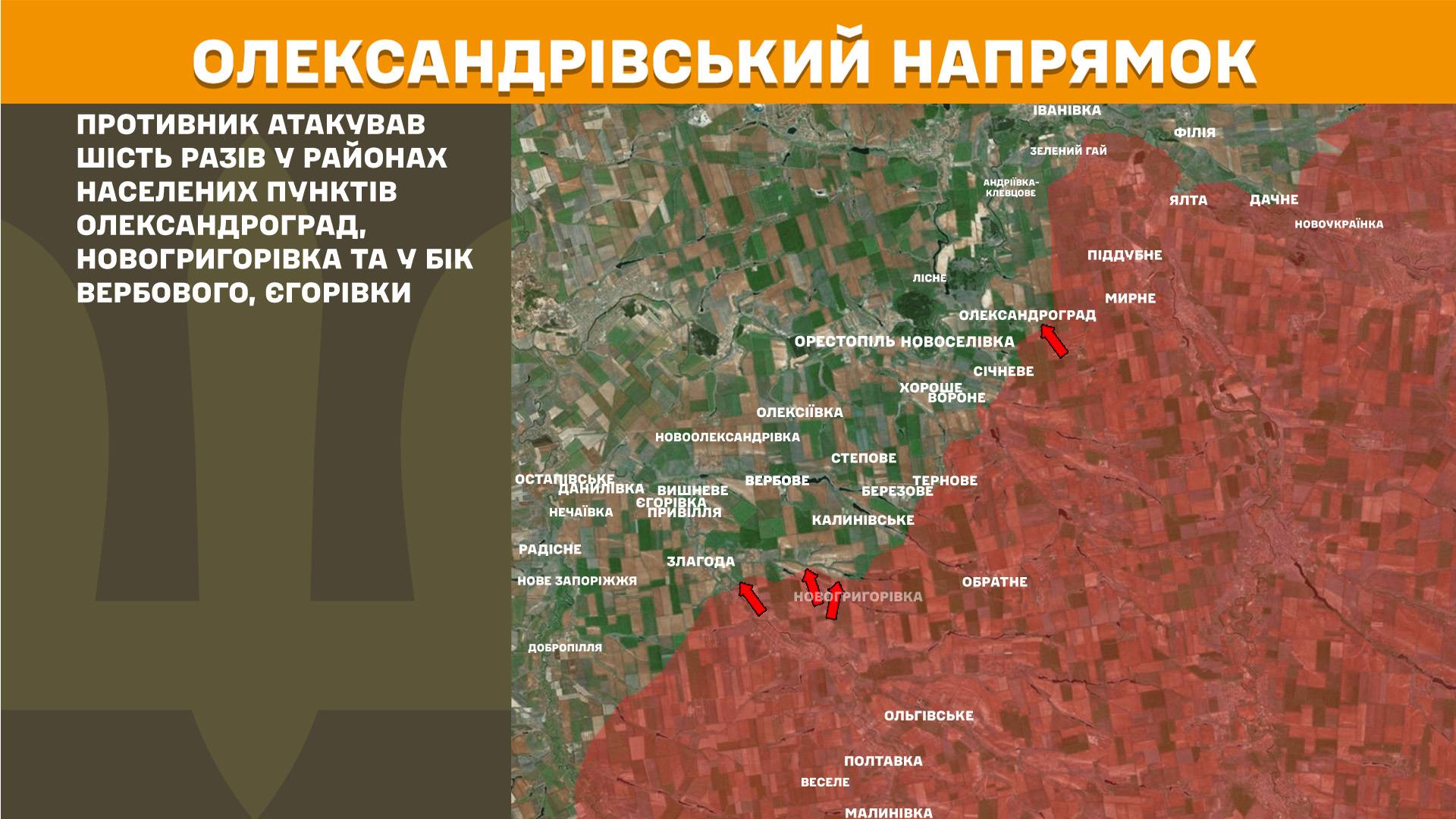 На Александровском направлении противник атаковал шесть раз в районах населенных пунктов Александроград, Новогригоровка и в сторону Вербового, Егоровки.