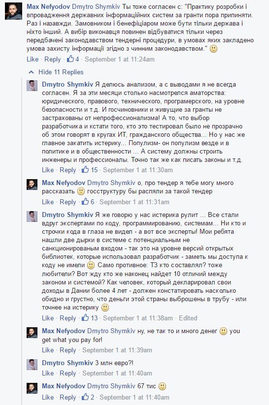 Шимкив отреагировал на реплику следующим образом: "Я же говорю: у нас истерика рулит... Все стали вдруг экспертами по коду, программированию, системам... Никто и строчки кода в глаза не видел - а вот все эксперты! Мои ребята нашли две дырки в системе с потенциальным несанкционированным входом - так это на уровне версий открытых библиотек, которые использовал разработчик. Заметь, мы доступа к коду не имели. Само противное: ТЗ кто составлял? Тоже любители? Вот жду, кто же наконец найдет 10 отличий между законом и системой? Как человек, который декларировал свои доходы в Дании более 4 лет, должен констатировать, насколько обидно и грустно, что деньги этой страны выброшены в трубу - или точнее на истерику".