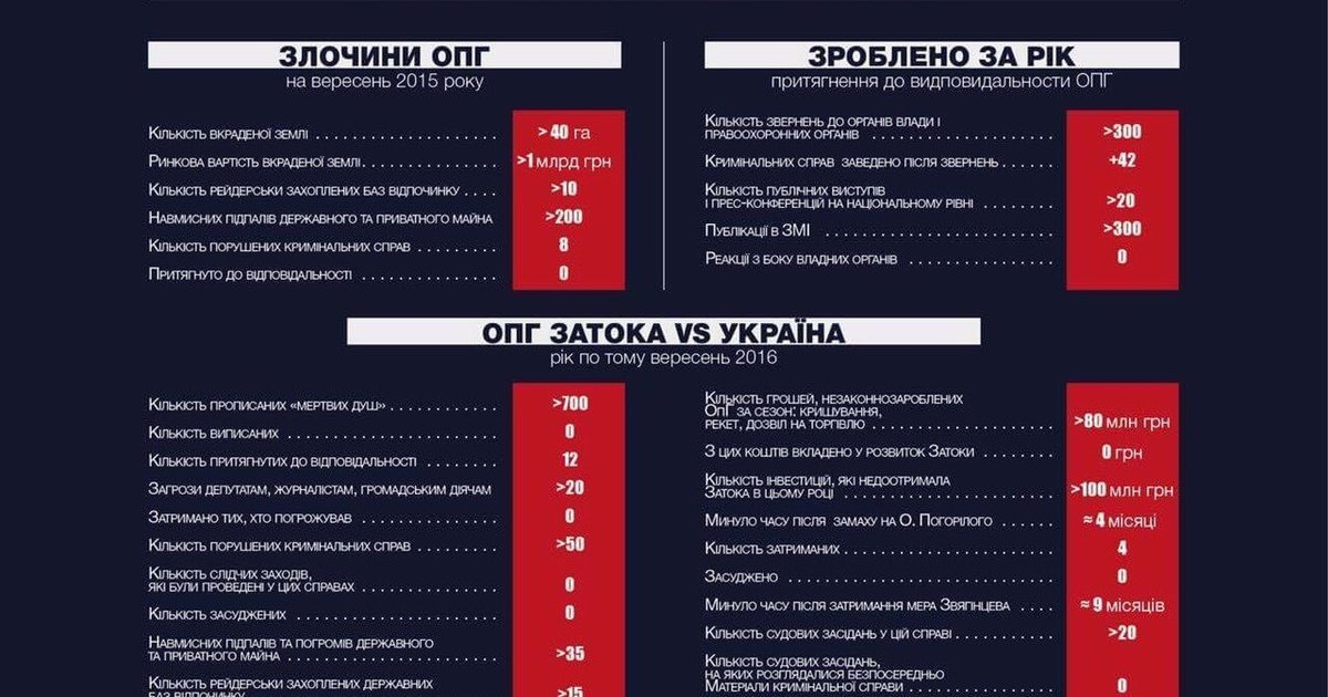 Он привёл факты и цифры о преступной деятельности ОПГ в Затоке. Рассказал о ситуации, которая сложилась в посёлке до сентября прошлого года - где по его словам было украдено более 40 гектаров земли на сумму более 1 млрд гривен, захвачено более 10 баз отдыха и осуществлено около 30 умышленных поджогов имущества. Но открыто по этим фактам было всего 8 уголовных дел и никто не привлечён к уголовной ответственности, - утверждает Погорелый.