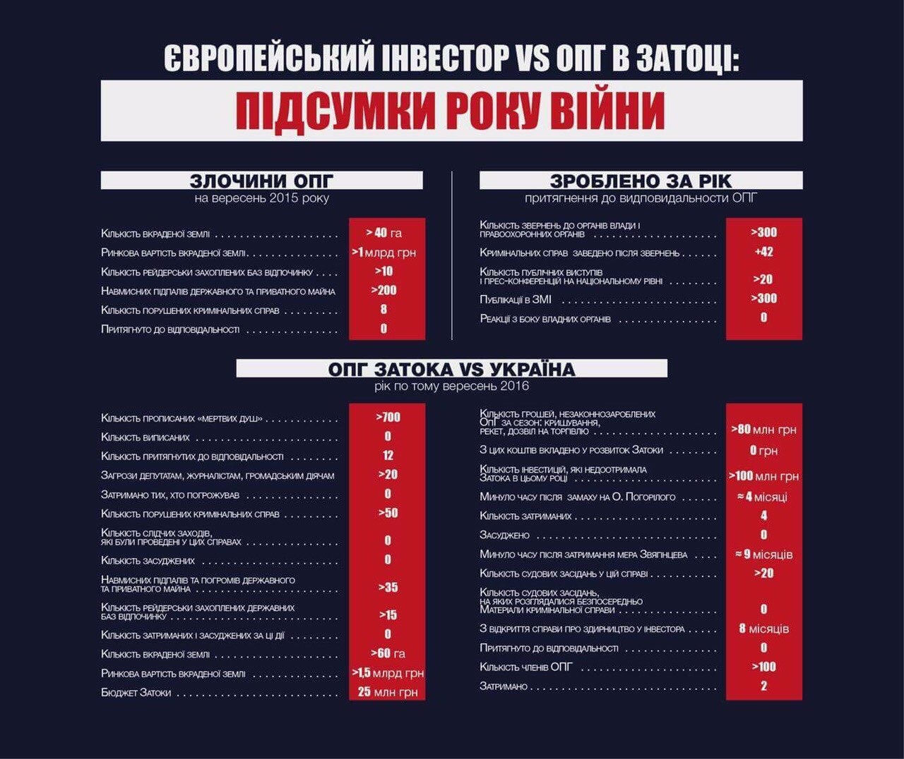 Погорелый также отметил, что из-за преступной деятельности ОПГ в Затоке, курортный посёлок недополучил только в этом году более 100 000 000 гривен, которые пошли бы на развитие, создание инфраструктуры и всех необходимых условий для развития туризма.