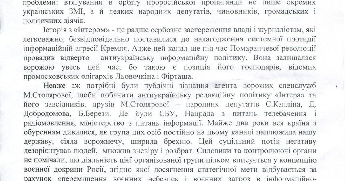 Неужели потребовались публичные признания агента вражеских спецслужб М.Столяровой, чтобы увидеть антиукраинскую редакционную политику "Интера" и его завсегдатаев, друзей М.Столяровой - народных депутатов С.Каплина, Д. Добродомова, Б.Березы. Где были СБУ, Нацсовет по вопросам телевидения и радиовещания, министерство по вопросам информации. Почти два года вся страна с возмущением смотрела, как группа этих лиц постоянно на этом канале поносила наше государство, сеяла вражду, распространяла ложь. Этот сплошной поток негатива дезориентировал людей, умножал уныние и раздоры. Силовики и контролирующие органы не замечали, что деятельность этой организованной группы вполне вписывается в концепцию военной доктрины России, согласно которой достижение стратегической цели происходит за счет "перемещения военных опасностей и военных угроз в информационно психологическое пространство во внутреннюю сферу страны противника".