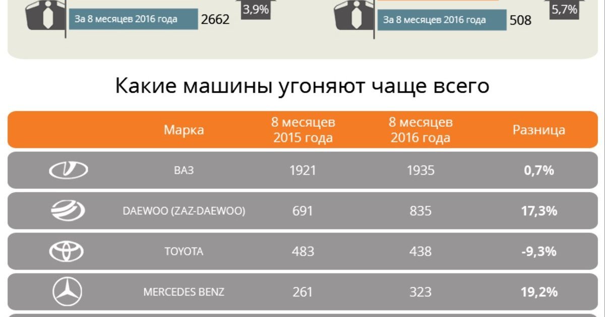 Согласно данным Национальной полиции Украины, которые проанализировала ЛІГА, за 8 месяцев 2016 года количество угонов автотранспорта сократилось, а раскрываемость преступлений, связанных с кражей автомобилей, выросла, сообщает Цензор.НЕТ.Самые популярные у преступников марки - ВАЗ, ЗАЗ и Toyota. По сравнению с прошлым годом чаще угонять автомобили BMW (+26%), Mercedes Benz (+19,2%) и ЗАЗ (+17,3%). Отрицательную динамику угонов в топ-10 угоняемых марок показали только Mitsubishi (-31,8%) и Toyota (-9,3%).