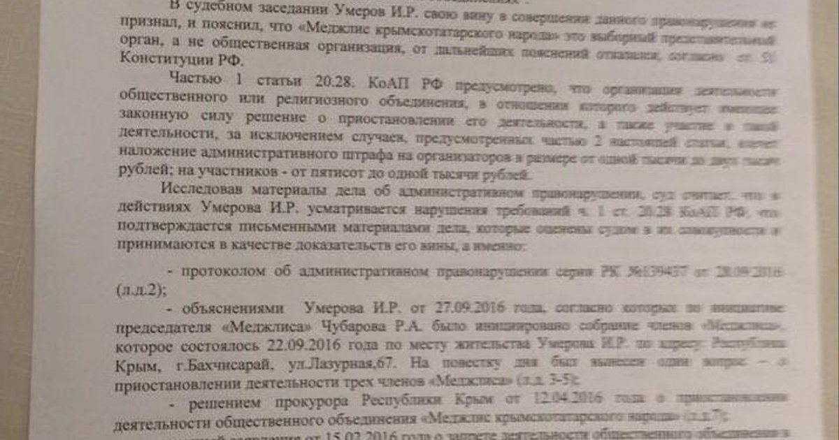 Об этом сам Умеров сообщил на своей странице в социальной сети "Фейсбук", передает Цензор.НЕТ."После составления админпротокола в РОВД, меня попросили пройти в Бахчисарайский райсуд, где судья Скисов А. Е. вынес решение признать меня виновным в совершении административного правонарушения по ч 1 ст 10.28 и назначил штраф 750 руб... Иными словами виновен в участии в заседании Меджлиса крымскотатарского народа...", - написал Умеров.
