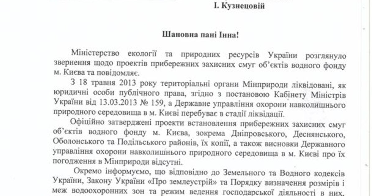 Государственное управление экологии Киева было ликвидировано 13 марта 2013 в соответствии с постановлением Кабинета министров Украины. Министерство экологии информировало программу "Схемы", что в их архиве оригиналы пропавших документов прибрежных защитных полос четырех районов Киева тоже отсутствуют.