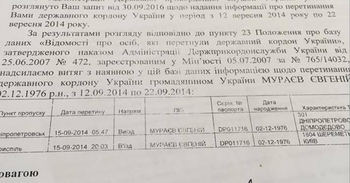 В документе говорится, что в период с 12 по 22 сентября 2014 года Евгений Мураев пересекал государственную границу лишь 15 числа - летал в Москву и обратно.