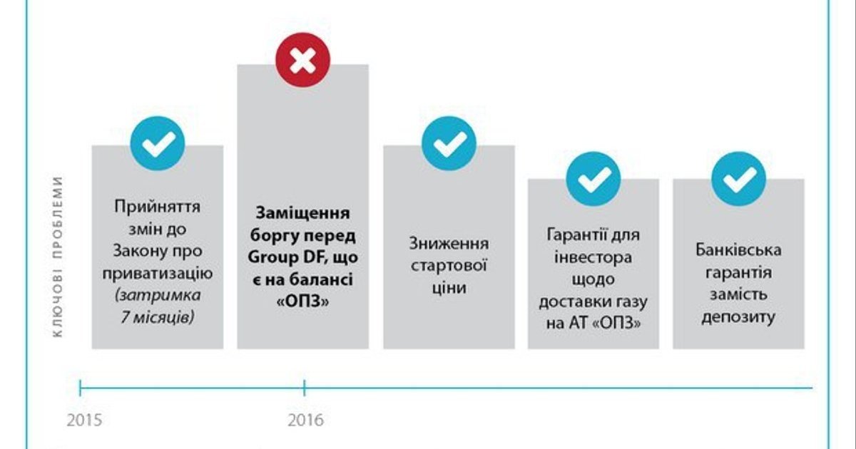 В частности, отмечается, что в 2015 году Верховная Рада только с задержкой в 7 месяцев приняла необходимые изменения в закон о приватизации, а Кабмин и НБУ так и не урегулировали вопрос замещения долга перед Group DF, находящегося на балансе ОПЗ. В то же время, по данным отчета, со стороны ФГИ были решены вопросы снижения стартовой цены и банковских гарантий вместо депозита, а со стороны НАК "Нафтогаз Украины" были предоставлены гарантии для инвестора по поставкам газа на ОПЗ.