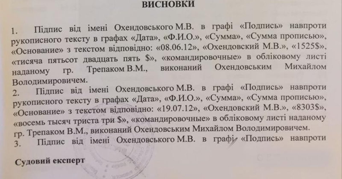 Согласно же другой экспертизы, проведенной Государственным научно-исследовательским экспертно-криминалистическим центром Министерства внутренних дел Украины (ГНИЭКЦ), подписи и записи от имени подозреваемого в «амбарные книге» принадлежат именно председателю ЦИК.