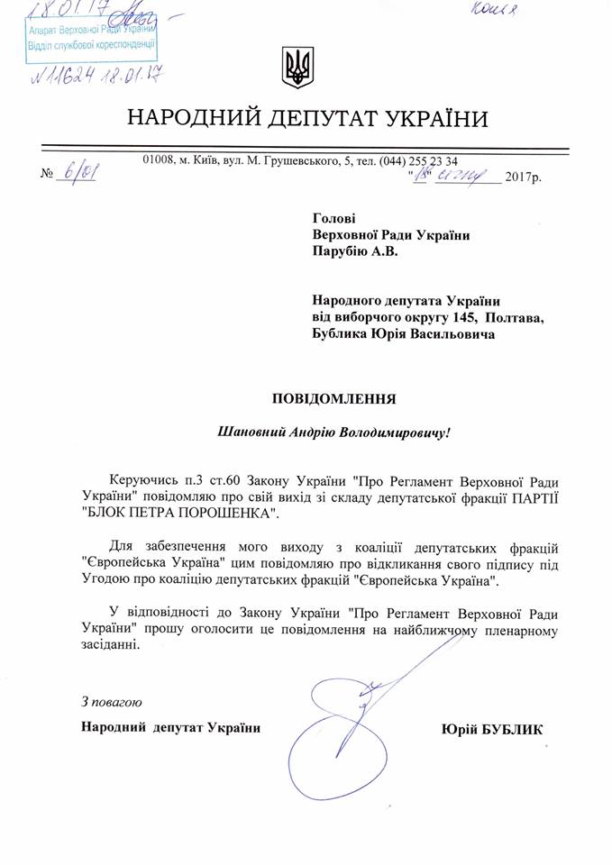 Нардеп Бублик вышел из фракции БПП и коалиции. ДОКУМЕНТ
