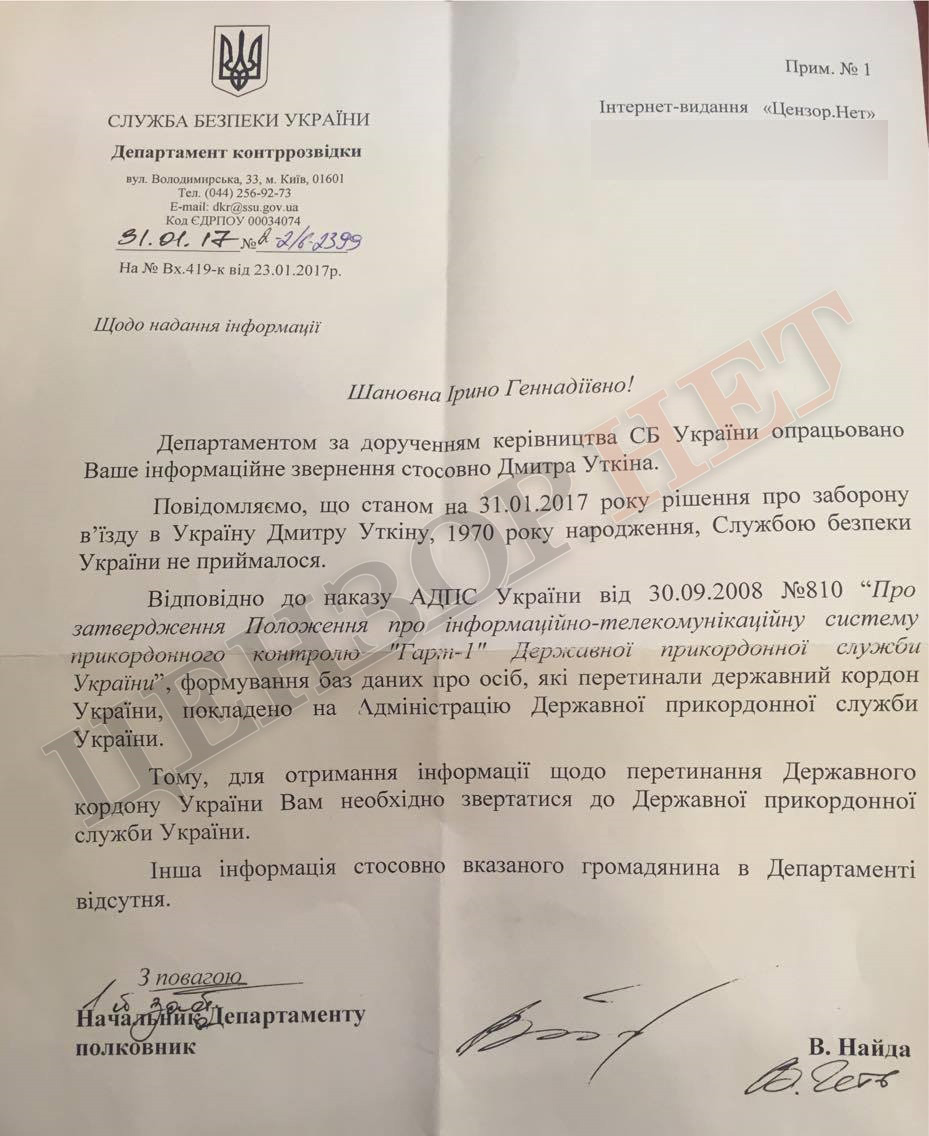 В документе говорится: "По состоянию на 31.01.2017 года решение о запрете въезда в Украину Дмитрию Уткину, 1970 года рождения, Службой безопасности Украины не принималось".