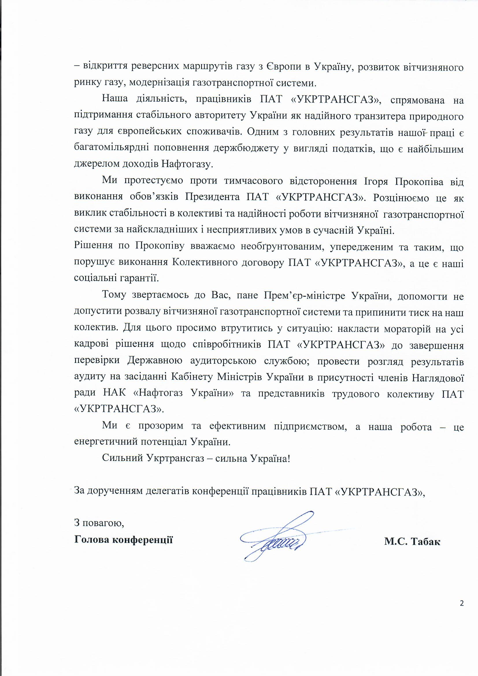 Трудовой коллектив также считает, что между ОАО "Укртрансгаз" и Наблюдательным советом НАК "Нафтогаз Украины" созданы искусственные преграды для донесения объективной информации о состоянии дел на предприятии.