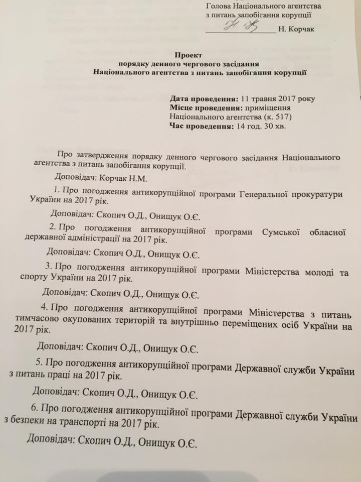 Корчак также обнародовала копию повестки дня заседания агентства в четверг, согласно которой рассмотрение вопросов проверки деклараций чиновников не были запланированы.