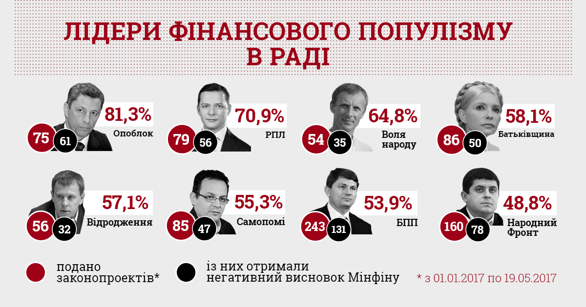 Лидерами "рейтинга популизма" стали депутаты фракции "Оппозиционного блока" - на протяжении января-мая они подали 75 законопроектов, из которых 61 (81%) получил отрицательное заключение Минфина.