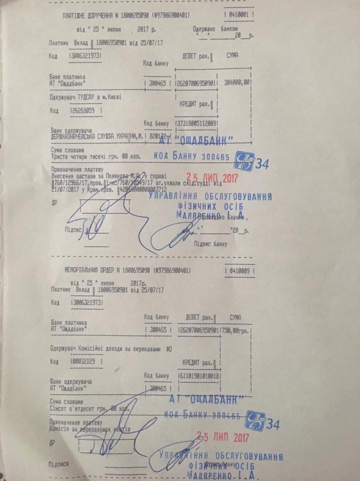 Нардеп Поляков внес 304 тыс. гривен залога. ДОКУМЕНТ