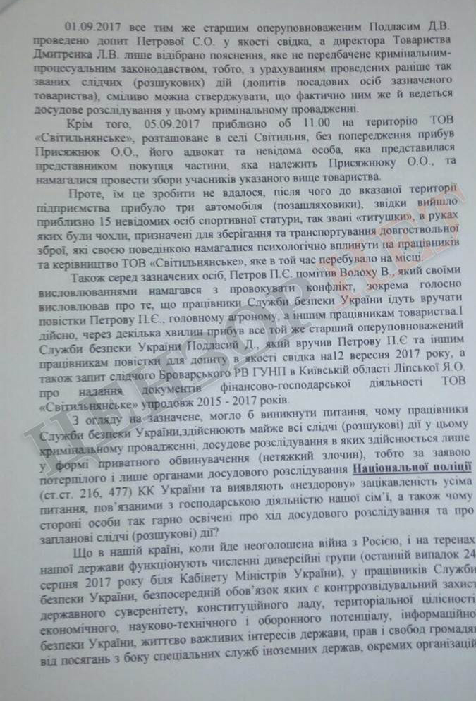В частности, они ставят вопрос о том, на каком основании представители Нацполиции содействовали действиям Волохи по остановке и проверке машин, выезжающих с предприятия. Также вопрос у адвокатов вызывают действия сотрудника СБУ Подласого, так как дело о хозяйственной деятельности ООО "Светильнянское" и других Предприятий Петрова открыто по ст. 191 Уголовного кодекса, досудебное расследование по которой должно проводиться в форме частного обвинения (нетяжелое преступление). Данная статья предусматривает, что открыто дело может быть только по заявлению потерпевшего, то есть самой компанией ООО "Светильнянское", а от имени компании такого заявления никто не подавал. Однако ходатайство о прекращении уголовного производства остается без рассмотрения. К тому же, данное дело должна расследовать Нацполиция, однако фактически, как утверждают адвокаты, следствие осуществляет сотрудник СБУ Подласый.