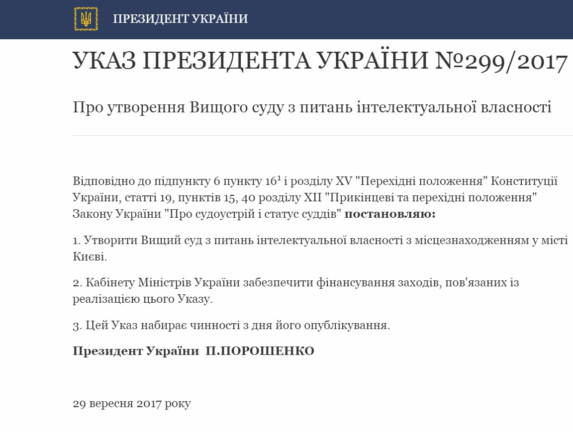 Президент Украины Петр Порошенко подписал указ о создании Высшего суда по вопросам интеллектуальной собственности.
