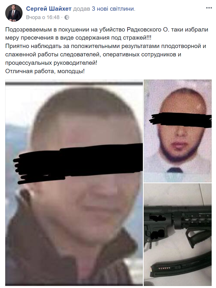 Как сообщает Цензор.НЕТ, об этом на своей странице в Facebook написал начальник следственного управления ГУНП в Одесской области Сергей Шайхет."Подозреваемым в покушении на убийство Радковского О. таки избрали меру пресечения в виде содержания под стражей!!!