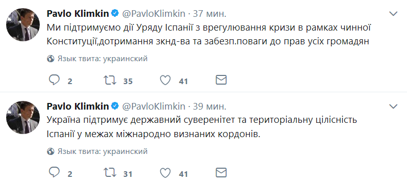 Об этом в Twitter написал министр иностранных дел Украины Павел Климкин, сообщает Цензор.НЕТ."Украина поддерживает государственный суверенитет и территориальную целостность Испании в рамках международно-признанных границ", - написал он.