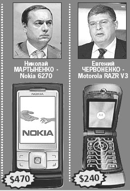 У лидера фракции «Наша Украина» в Верховной Раде предыдущего созыва Николая Мартыненко как раз подобный мобильник Nokia 6270 (цена – 470 долларов*). Заряда аккумулятора хватает на 200 часов, имеется диктофон, модем, органайзер, слот для флэш-карт. И больше ничего лишнего – фотоаппарат чисто символический, дизайн корпуса обычный.