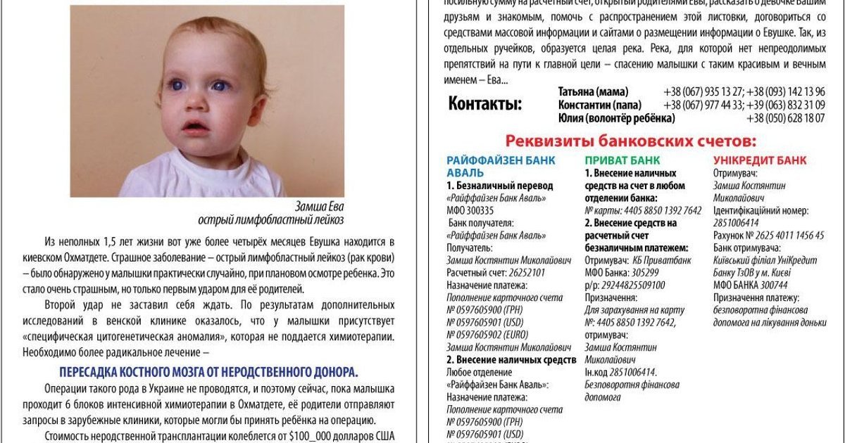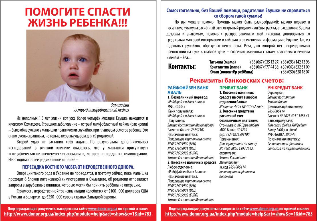 Но вы можете помочь. Помощь может быть разнообразной: можно перевести посильную сумму на расчётный счет, открытый родителями Евы, рассказать о девочке Вашим друзьям и знакомым, помочь с распространением этой листовки, договориться со средствами массовой информации и сайтами о размещении информации о Евушке. Так, из отдельных ручейков, образуется целая река. Река, для которой нет непреодолимых препятствий на пути к главной цели – спасению малышки с таким красивым и вечным именем – Ева...
