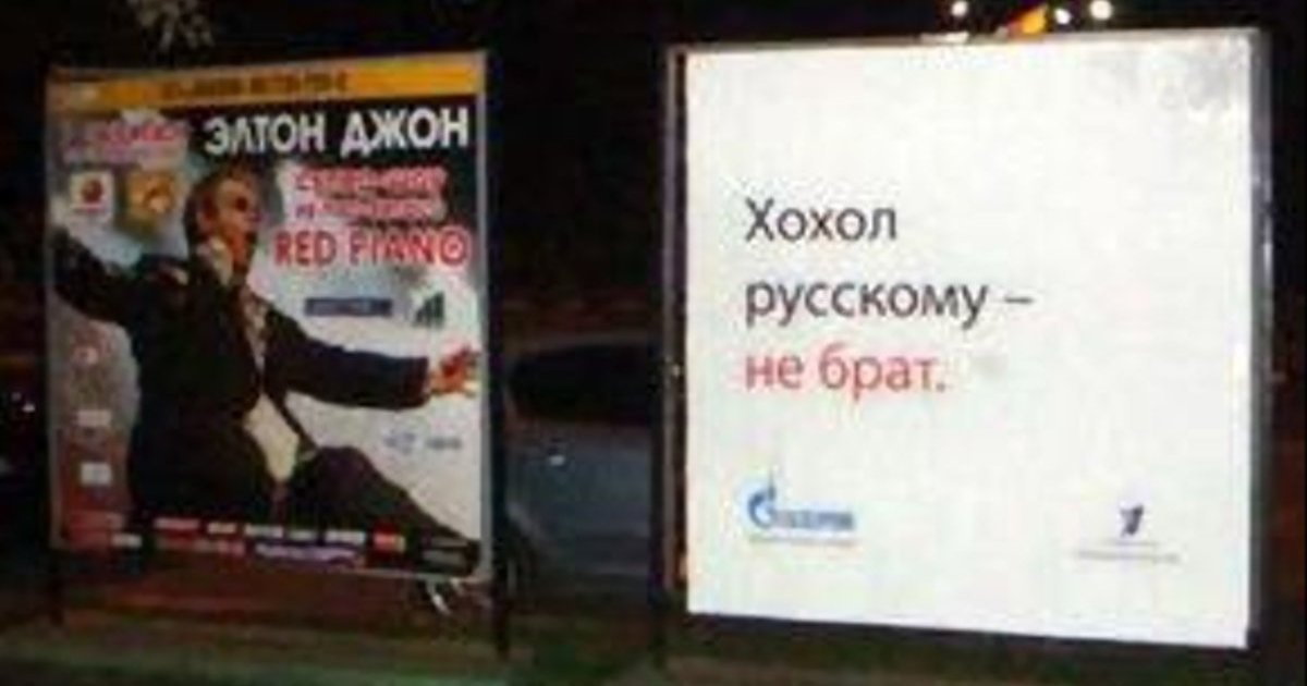 Еще два постера посвящены конфликтам России с Грузией и Украиной. Так, на одном из них написано "Грузин русскому – не товарищ", а на втором – "Хохол русскому – не брат". В обоих случаях отмечается, что информационным спонсором якобы выступает Первый канал. Правда, в ситуации с Грузией указывается, что это якобы программа прокремлевского движения Наши, а во втором – компании Газпром.