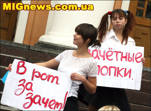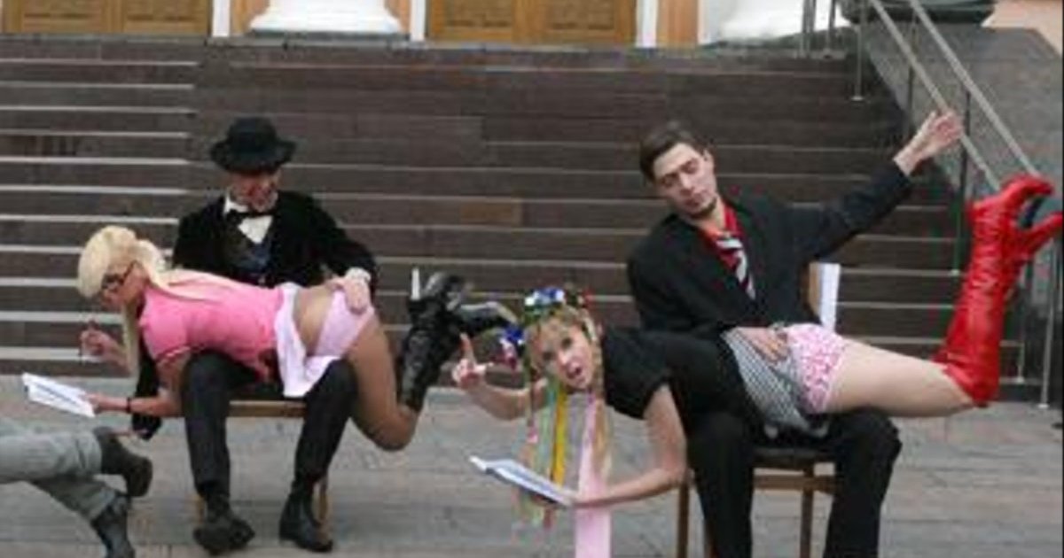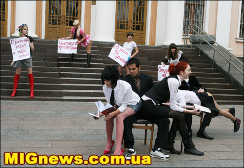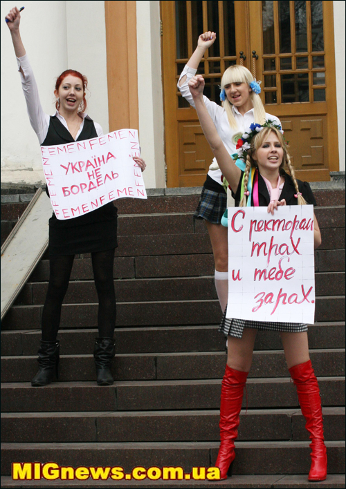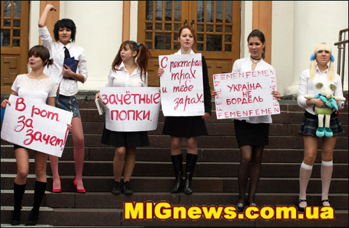 Девушек FEMEN прилюдно отшлепали "преподаватели", тем самым демонстрируя возмутительную ситуацию, которая стала традиционной для вузов Украины. Ректоры, деканы и преподаватели бессовестно используют свое положение для сексуального шантажа молодых студенток взамен на успешную учебу и жилье в общежитии.Кроме того, женское движение FEMEN потребовало от Министерства образования и науки Украины: создать комиссию для внутреннего расследования фактов сексуальных домогательств ректорско-преподавательского состава по отношению к студенткам; организовать анонимную "горячую линию" для обращения пострадавших; лиц, подозреваемых в развратных действиях, немедленно отстранить от исполнения служебных обязанностей.