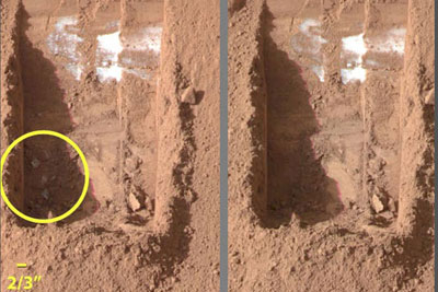 3. Замыкает тройку призеров обнаружение воды на Марсе, которое удалось космическому аппарату Phoenix в 2008 году. Тогда этот аппарат вырыл слой белого вещества, которое под косыми лучами приполярного марсианского солнца испарилось.