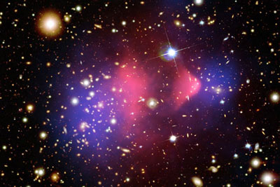 8. Следующую позицию занимает косвенное свидетельство существования темной материи, выявленное при наблюдениях за объектом 1E0657-56, представляющим собой два взаимодействующих скопления галактик. Наблюдения рентгеновского телескопа Chandra показали, что для образования такого объекта необходимы громадные массы невидимого вещества.