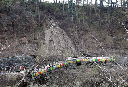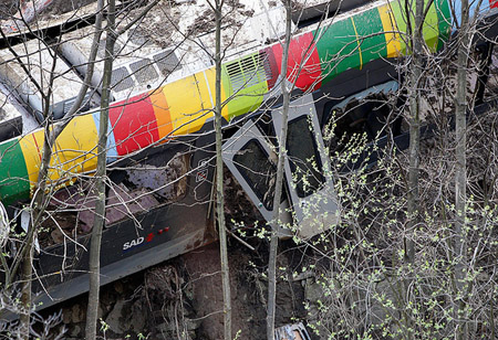 Один из вагонов состава уничтожен практически полностью, еще один завис над обрывом. Жертвами катастрофы стали по меньшей мере семь человек, десятки получили ранения. В качестве основной причины схода поезда с рельсов называют оползень.