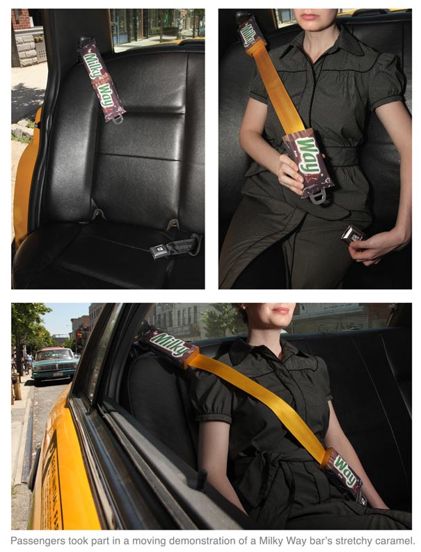 Milky Way: ремень безопасности. Пассажиры приняли участие в подвижной демонстрации тянущейся карамели Milky Way. BBDO New York, USA.