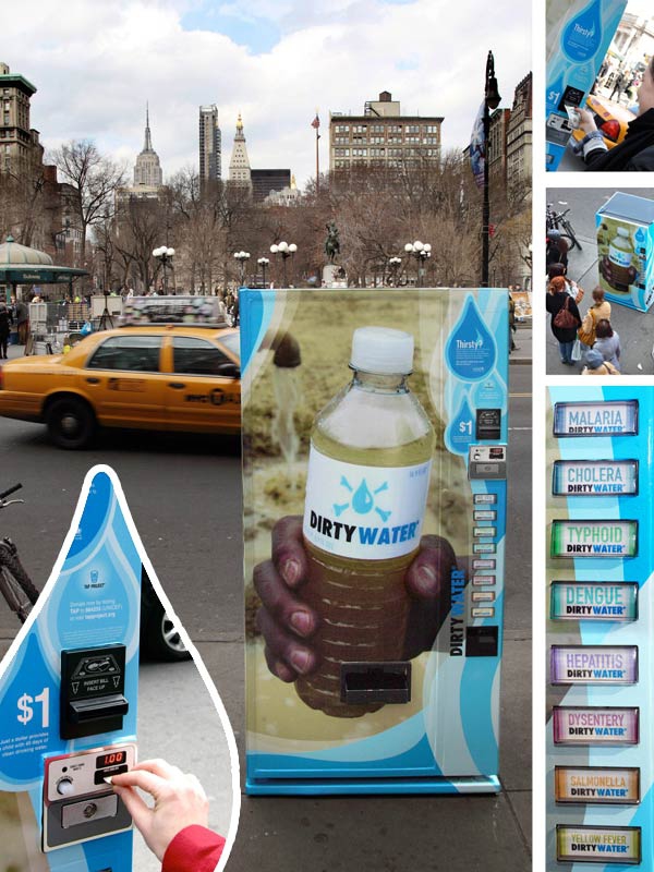 Unicef – автомат по продаже грязной воды. "Мы разлили грязную воду по бутылкам в 8 смертельных разновидностях, сделали для нее автомат, и запустили продажу в Манхэттене за $ 1. Хотите пить? Миллионы людей во всем мире, которые не имеют доступа к чистой питьевой воде тоже хотят. Каждый день 4200 детей умирают от болезней связанных с водой. Помогите обеспечить развивающиеся страны безопасной питьевой водой . Пожертвуйте сегодня. tapproject.org ". Casanova Pendrill, NY, USA