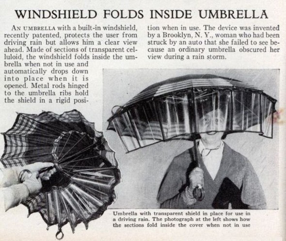 Зонт с "лобовым стеклом" на случай дождя с ветром (США, 1936)