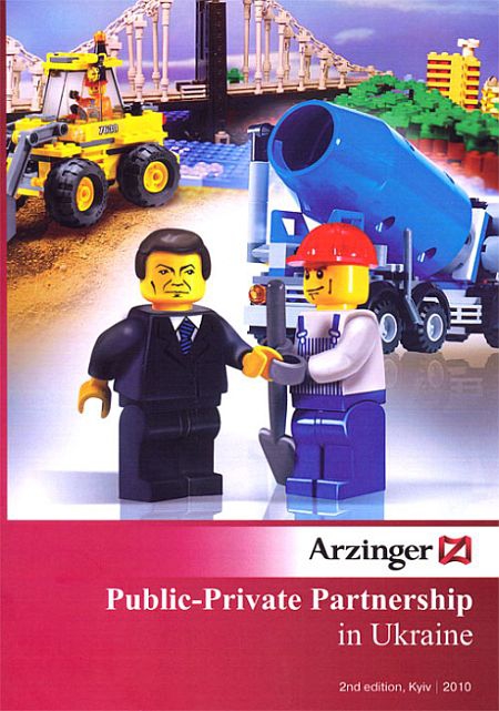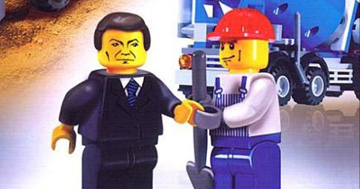 Так компания "Arzinger" представила плакат, на котором изображен лего-человечек, похожия на Януковича, пожимающий руку рабочему.Материал представлен на III Международном инвестиционном саммите Donbass Investment Destination "Государственно-частное партнерство в контексте новой экономической политики Украины", в которм также принимает участие сам Янукович.