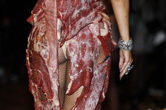Фото Майка Блейка. США, Лос-Анджелес. Платье певицы Леди Гага, которое она выбрала для выступления на церемонии вручения музыкальной премии MTV Awards, было изготовлено из кусков мяса. (Reuters)