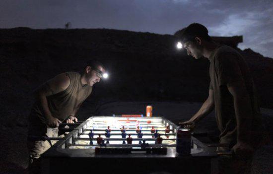 Фото Боба Стронга. Афганистан, провинция Кандагар. Американские солдаты играют в настольный футбол ночью при свете фонариков. (Reuters)