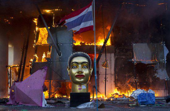 Фото Адриса Латифа. Таиланд, Бангкок. Тысячи участников антиправительственного протеста из движения "красных рубашек" в течение шести недель "удерживали" площадь в центре Бангкока. Тайские войска провели операцию по захвату лагеря "красных рубашек". Статуя, украшенная тайским национальным флагом, на фоне Всемирного торгового центра в Бангкоке, который сгорел дотла. (Reuters)