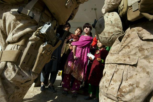 25-летняя сержант Шина Адамс развлекает афганских мальчишек, надувая пузыри, во время патрулирования Муса Калы. (Paula Bronstein / Getty Images)