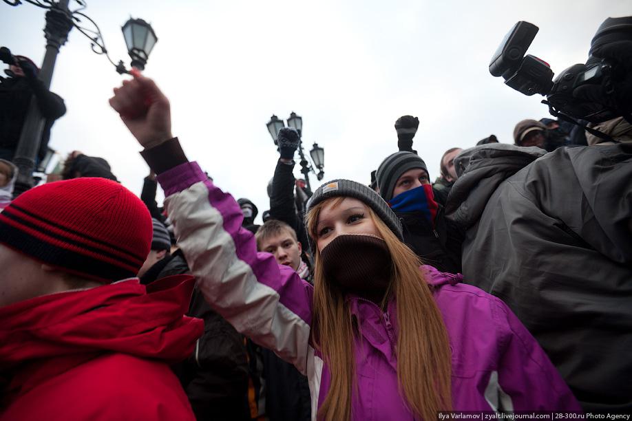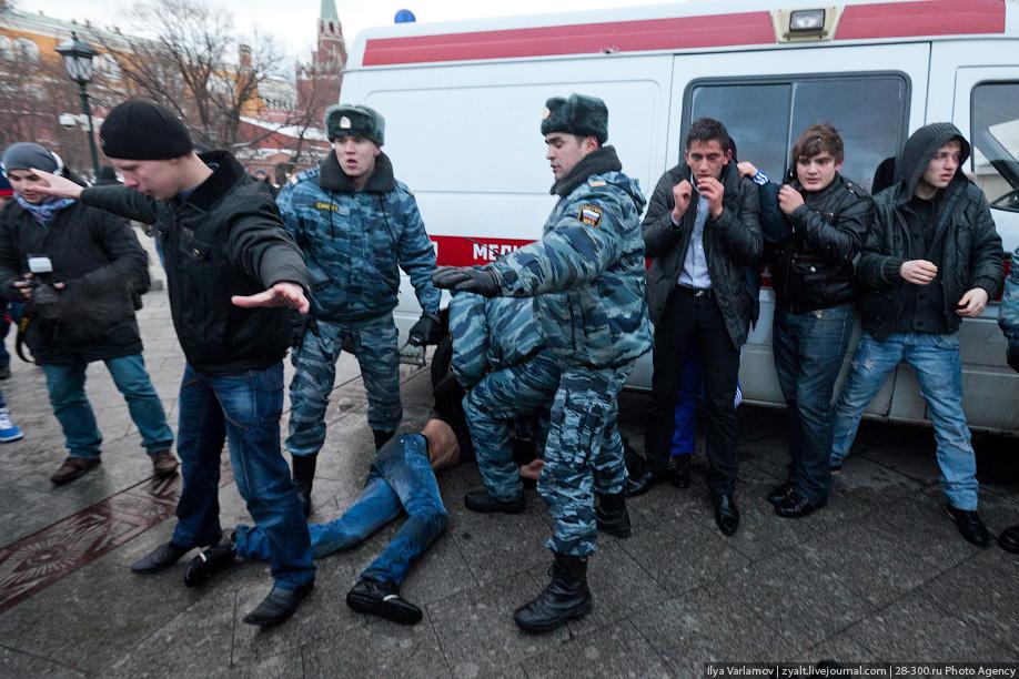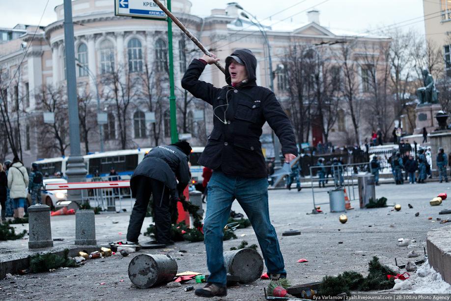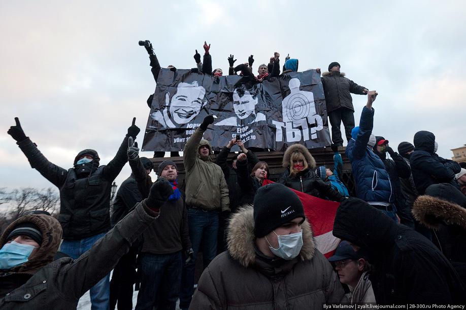 На Манежной площади в Москве прошли массовые беспорядки. В память об убитом Егоре Свиридове на площадь пришли около 10 000 человек, сначала они жгли фаеры и скандировали националистические лозунги, а через 30 минут начались столкновение с ОМОНом.
