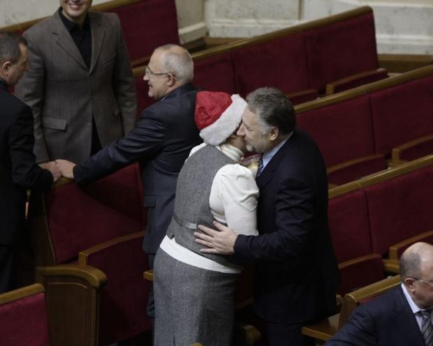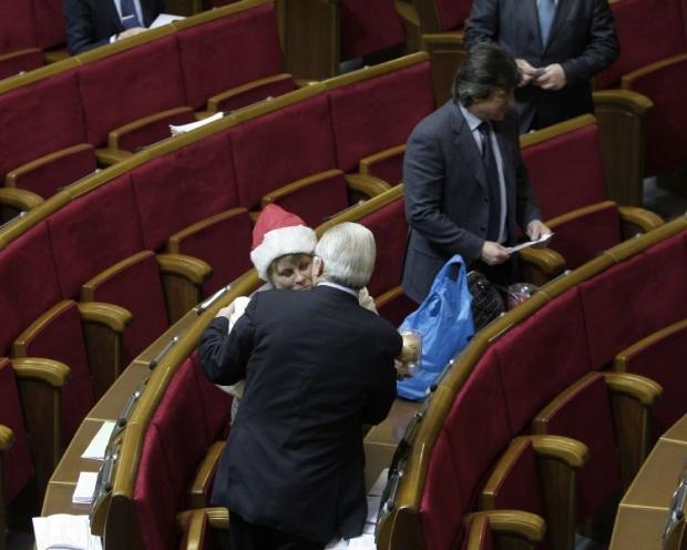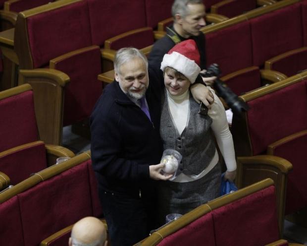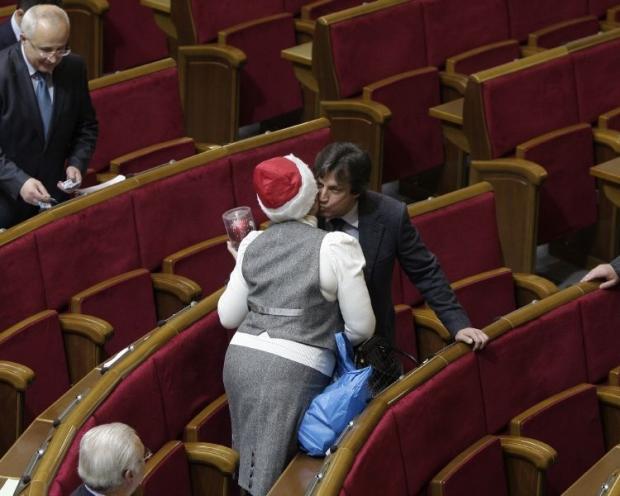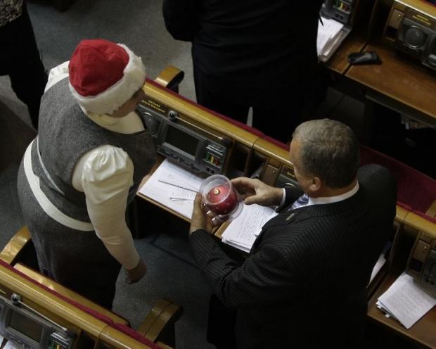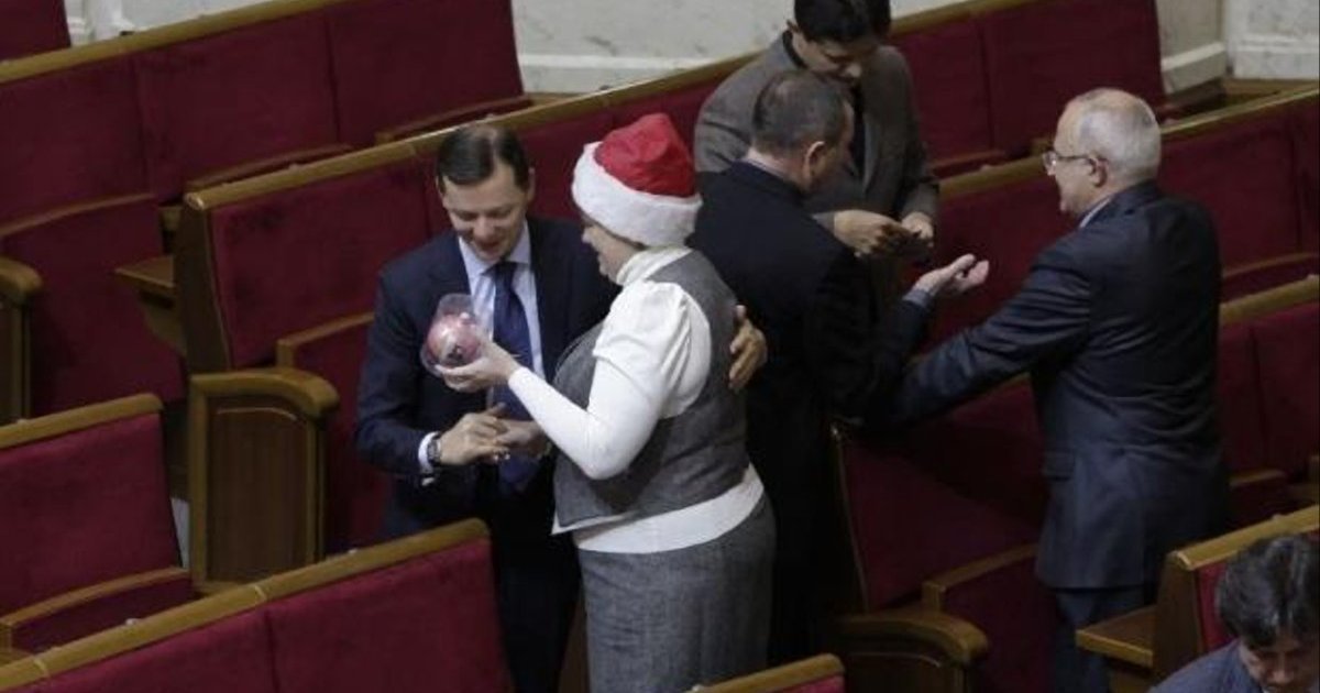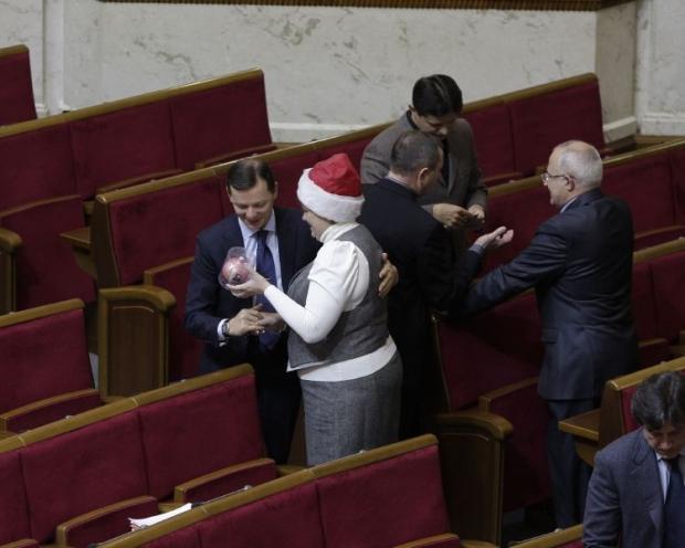 Сегодня перед началом пленарного заседания народный депутат из НУ-НС Екатерина Лукъянова поздравляла своих коллег с Новым годом. Она ходила по сессионному залу с синим пакетом. Избранным дарила по одному елочному украшению. Внефракционному Олегу Ляшко нардеп вручила розовый шарик на елку.