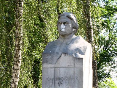 Сегодня, 17 июня, неизвестные серьезно повредили памятник Надежде Крупской, что возле Дарницкого вокзала в Киеве.
