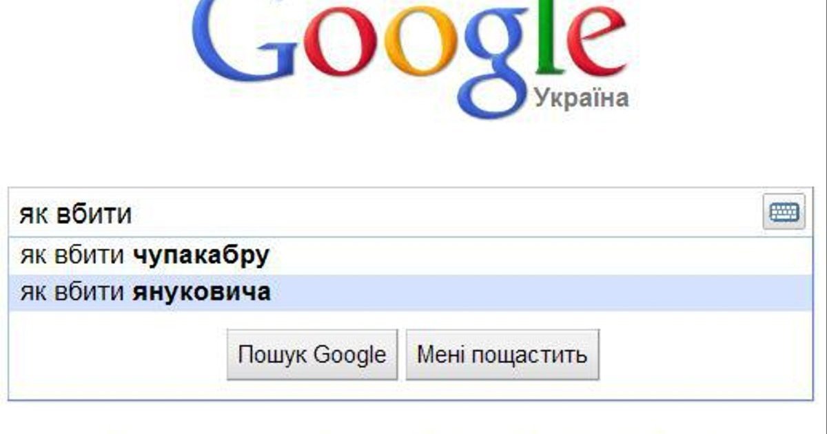 При вводе в поисковом сервисе Google словосочетания «Як вбити» в диалоговом окне выдаются запросы «як вбити чупакабру», и «як вбити януковича».