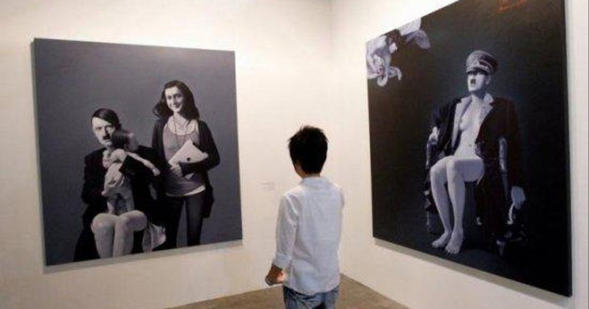 На другой картине Гитлер уже изображен с младенцем Иисусом на коленях, на третьей - фюрер демонстрирует татуированный лагерный номер на запястье и показывает обнаженную женскую грудь.