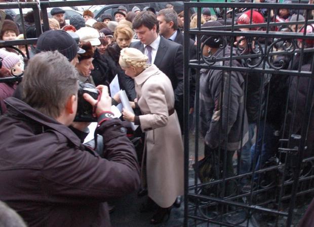 Как только вышла из черного "мерседеса", к ней бросились несколько поклонниц с ярко накрашенными губами. По очереди начали целовать Тимошенко в щеки. Одна из женщин увидела, что оставила на щеке лидера БЮТ след от помады. Начала вытирать ее.