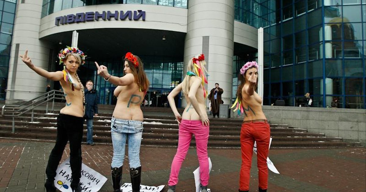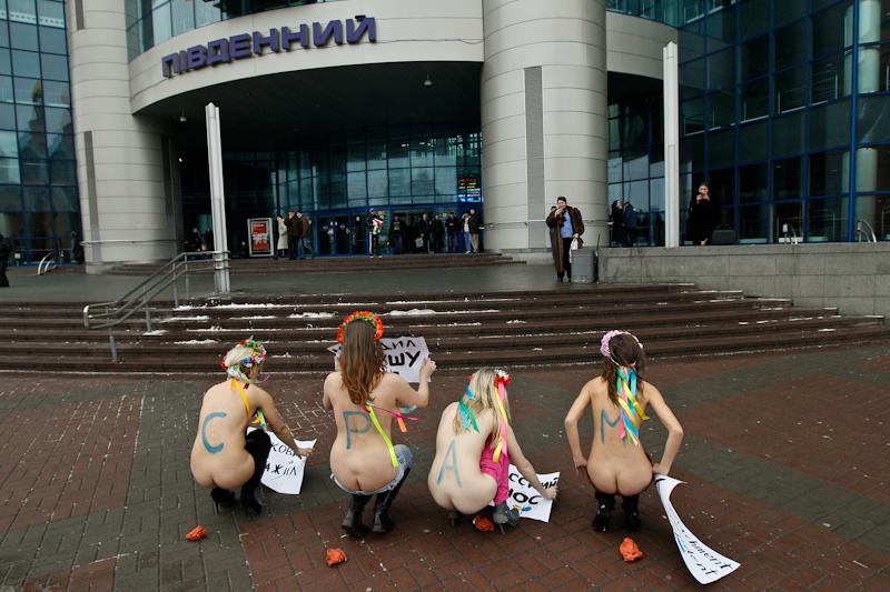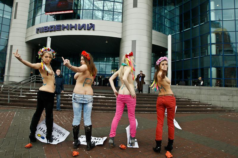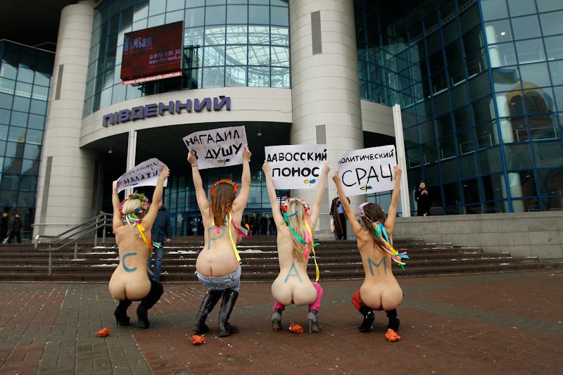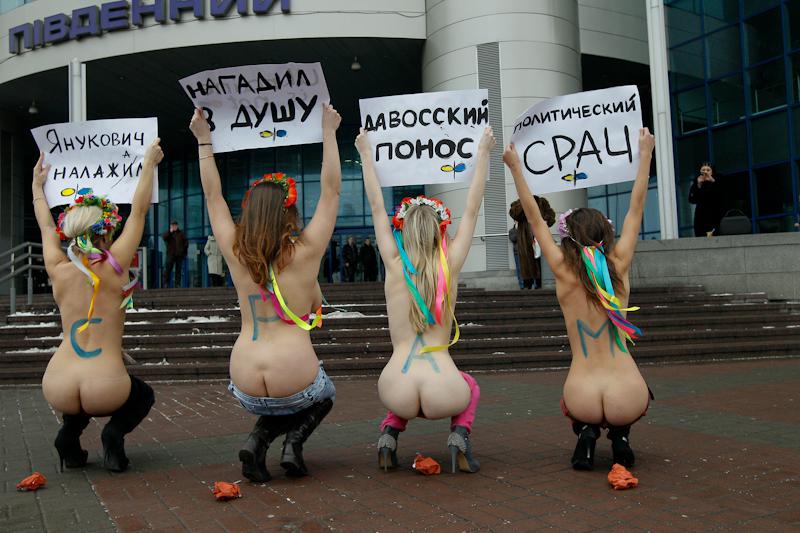 Сегодня в 12.00 на площади возле Южного железнодорожного вокзала движение FEMEN провело "какцию" против унизительных для женщин Украины заявлений президента Януковича, озвученных им на Давоском саммите. На плакатах активисток кросовались слоганы "Политический срач", "Нагадил в душу", "Януковичу импичмент".