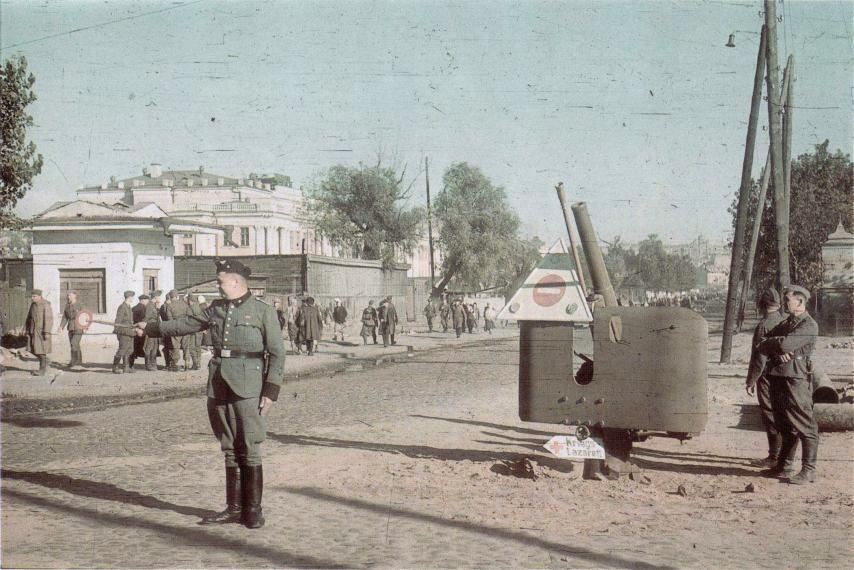 Немецкий регулировщик на пересечении бульвара Т. Шевченко и нынешней улицы Вячеслава Чорновола. В правой руке регулировщик держит жезл, справа стоит советское зенитное орудие, оставшееся со времени обороны Киева. На броневом щите укреплен немецкий треугольный дорожный знак «Проезд закрыт» с тремя светоотражателями. Под щитом пушки — стрелка-указатель с красным крестом и надписью: «Kriegs Lazarett» (Военный госпиталь). Справа — металлическая трансформаторная будка, в глубине кадра видны дома на бульваре и купола Владимирского собора.