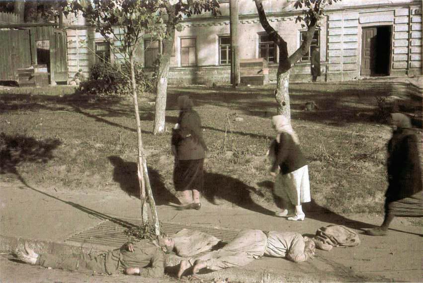 Убитые советские военнопленные на улице Киева. Один из них одет в гимнастерку и галифе, другой — в нижнем белье. Оба разуты, босые ноги в грязи — шли босиком. У убитых- истощённые лица. Очевидцы вспоминают, что, когда пленных гнали по киевским улицам, конвоиры расстреливали тех, кто не мог идти. Прохожие торопятся проскочить опасное место, где стоит немец с фотоаппаратом. На втором плане — старый киевский дом, переоборудованный под какое-то производство: в стене — круглое отверстие для осевого вентилятора, окна помещения закрашены, рядом стоят большие ящики с ручками для переноски. На дверях нанесен белый крест, очевидно, он должен свидетельствовать о том, что в доме нет евреев — накануне в Киеве прошли массовые расстрелы еврейского населения.