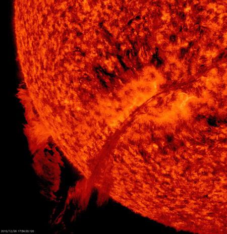 Конечно, смайлик на поверхности Солнце – не более чем интересное магнитное явление. Каждому известно из школьного курса физики про силовые линии магнитного поля. Именно они и образовали «глаза» и «губы» Солнца, расплывшиеся в улыбке. Кстати, ее размеры поистине впечатляют. Например, «глаз» светила почти в четыре раза больше Земли.Менее недели назад – шестого декабря 2010 года – спутнику удалось заснять еще одну удивительную картину: Солнце показало язык. Видео, которое удалось получить астронавтам, очень короткое – оно длится всего семь секунд, однако, хорошо видно, как гигантская нить обвивается вокруг раскаленного шара. Длина «языка» составляет более половины радиуса Солнца, и специалисты НАСА отмечают, что с каждым днем он становится все больше. Астронавты заметили нити еще две недели назад, однако, затем на некоторое время она исчезал из их поля зрения.
