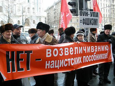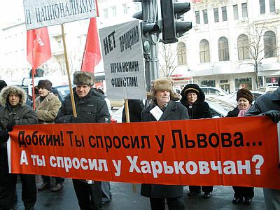 Пикетирующие выстроились вдоль здания мэрии с плакатами и транспарантами: «Добкин, ты спросил у Львова. А ты спросил у Харьковчан?», «Нет возвеличиванию нацистских пособников!», «Нет распространению идей расизма и фашизма на Харьковщине!», «ОУН-УПА = фашизм!», «Нет прощения украинским фашистам!».