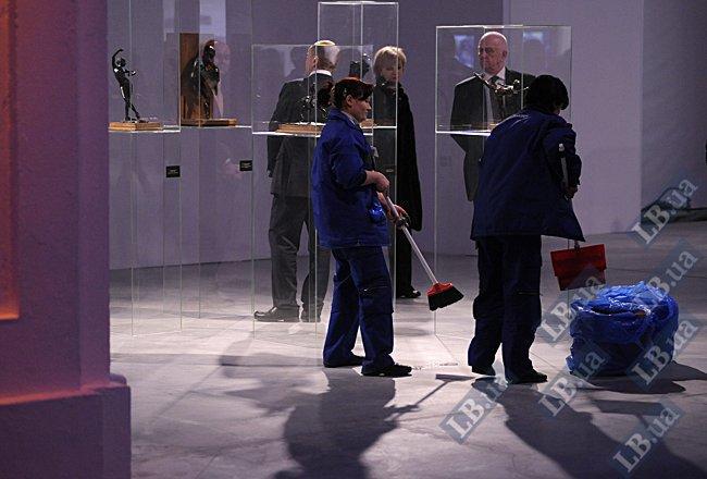 Главное украшение выставки полное собрание мастера французского импрессионизма Эдгара Дега - 74 бронзовые скульптуры. По оценкам специалистов, стоимость каждой составляет несколько десятков тысяч долларов.Увидеть шедевры пластики в этот вечер прибыли и представители власти: министр культуры Михаил Кулиняка и зам главы администрации Анна Герман. Увлеченный фотографированием чиновников, один из фотокорров неловким движением зацепил стеклянный куб, в котором находилась скульптура «Танцовщица выгибается».