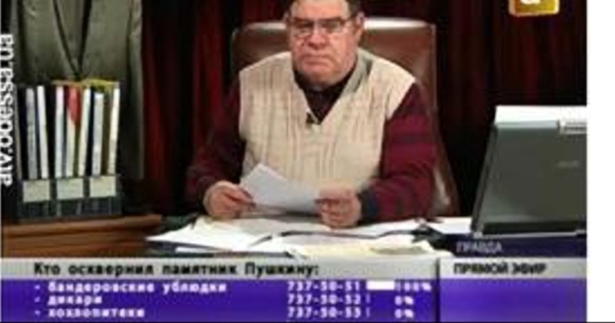 Это кадр из передачи на одесском телевидении. В студии Григорий Кваснюк. На днях неизвестные нарисовали свастику на спине одесского памятника Пушкину, в связи с чем ведущий решил провести опрос, кто же совершил этот акт вандализма, и предложил три варианта ответа - "бандеровские ублюдки", "дикари" и "хохлопитеки".